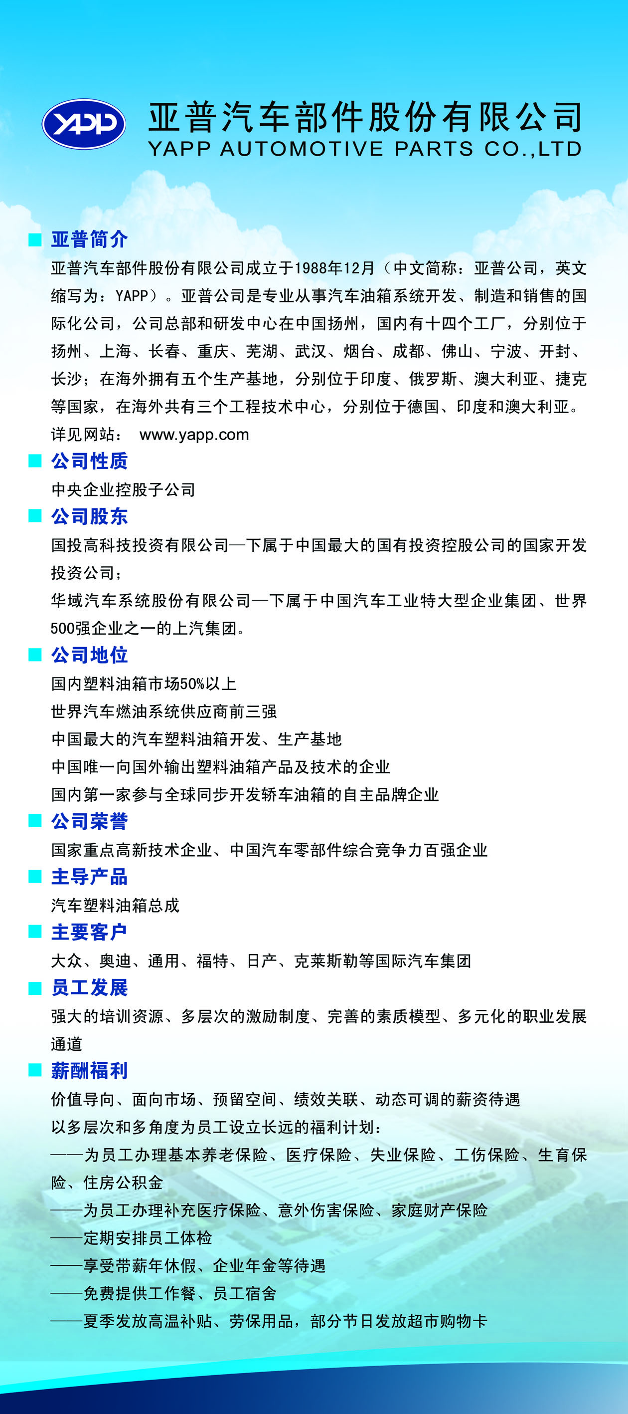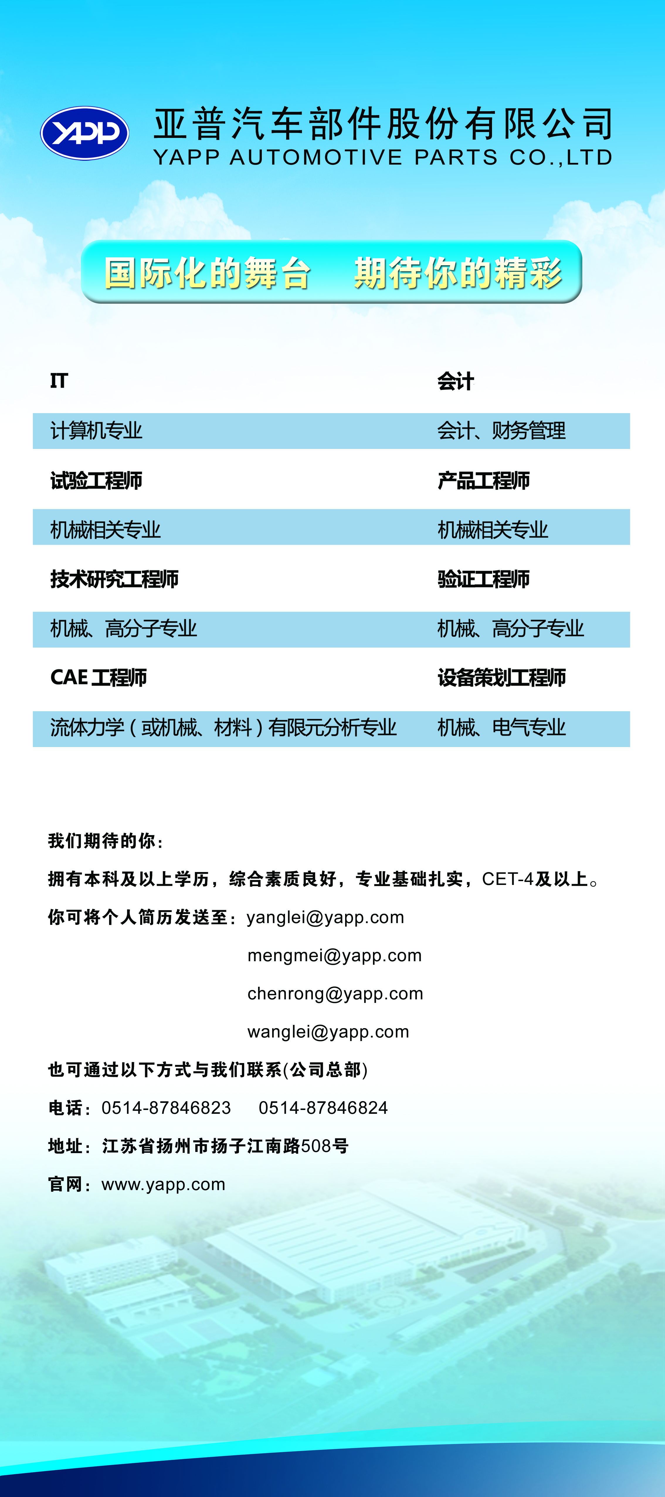 亚普汽车部件股份有限公司 2015年校园招聘 10月10日,下午3点;地点为:报告厅南高厅。