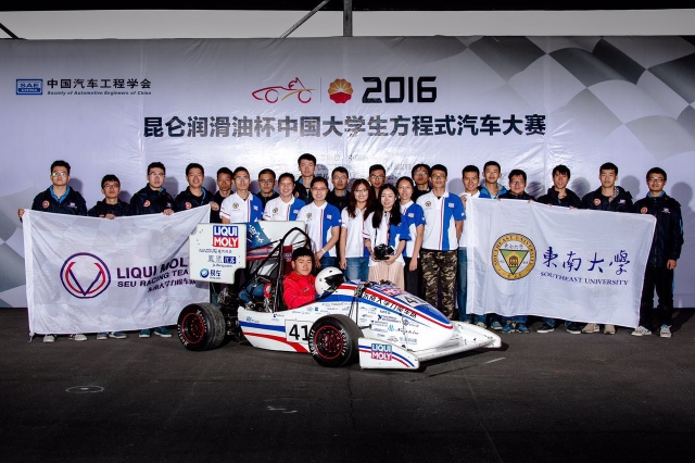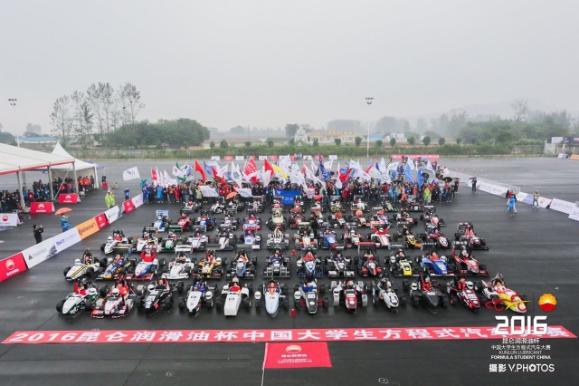 10月11日至15日,“2016昆仑润滑油杯中国大学生方程式汽车大赛”在湖北襄阳梦想方程式赛车场隆重举行。本届大赛是中国大学生方程式汽车大赛的第七届比赛,大赛共有79支车队报名参加,共计1467名参赛队员,2000多名观摩队员,在4个比赛日内展开设计(150分)、制造成本分析(100分)、营销报告(75分)、直线加速(75分)、8字绕环(50分)、高速避障(150分)、耐久赛(300分)、燃油经济性(100分)八个项目共1000分的角逐。