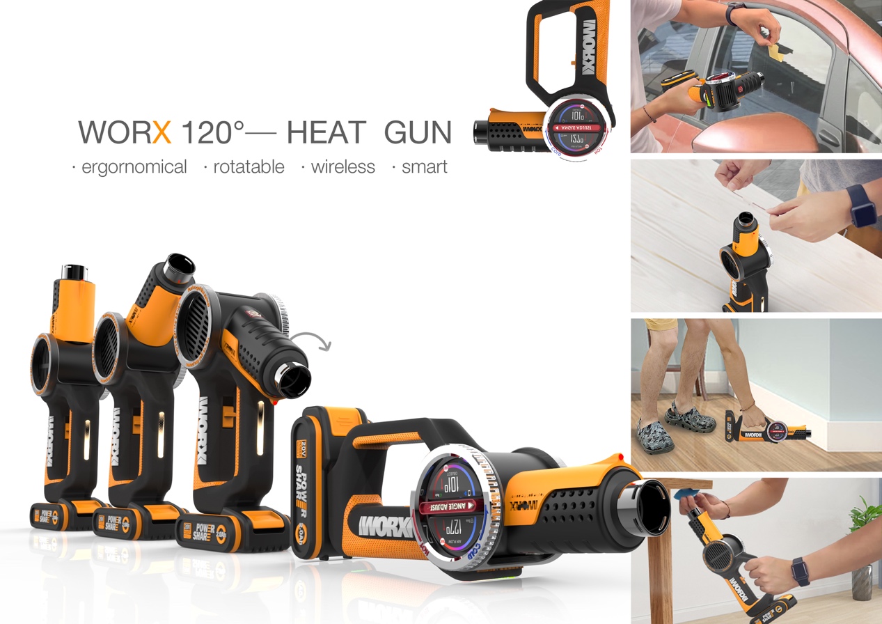 “WORX 120°”是一款人机工学多功能热风枪,创新性地提出了产品中的旋转结构、多种握持方使用方式以及数码化的控制方式。设计的过程中邀请了大量用户实地进行草模的使用评测,得到了准确的抓握尺寸以及操作方式上的人机关系,在此基础上使用3D打印技术做出原型进一步优化用户体验,最终得出了合理的操作布局、产品功能和外观造型,使人机交互的效率和可靠度以及用户使用感受舒适度得到提升。(文,图:牛亚峰,马国瑞)