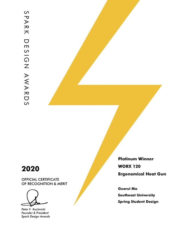 星火国际设计奖(Spark Awards)是全球涵盖范围最广、专业化水平最高、影响最为深远的设计大奖之一,包括Google、Beats、戴尔、施华洛世奇、飞利浦等世界知名品牌将其作为引领世界潮流和设计定位的标杆。此次获奖是我院工业设计专业学生斩获的又一国际顶级大奖,获奖作品“WORX 120° Ergonomical Heat Gun”将在美国旧金山Autodesk展览中心全年展览,并无限期在Spark官网的设计年鉴中展示。