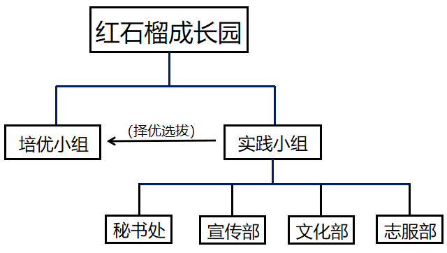 红石榴成长园下设实践小组和培优小组,实践小组内部包含秘书处、宣传部、文化部、志服部,其主要职能如下:
