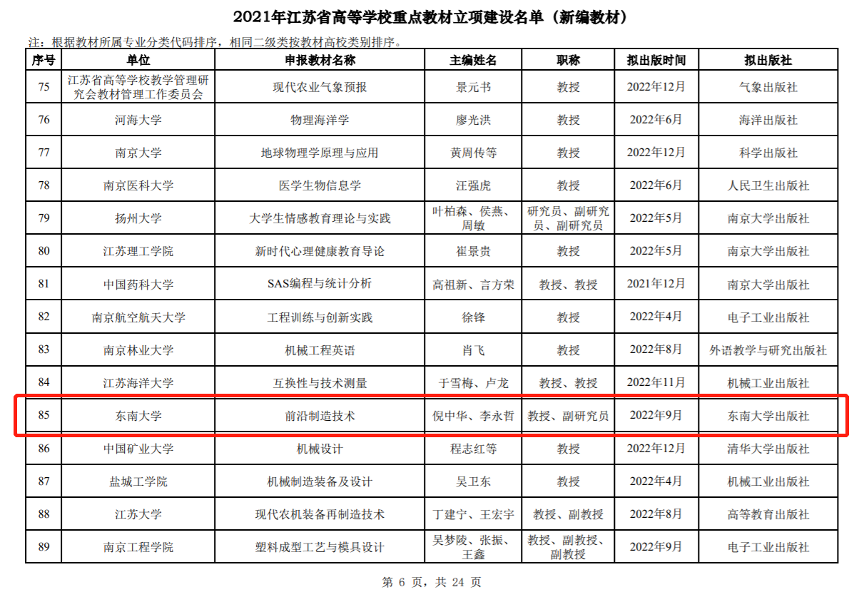 近日,江苏省高等教育学会发布了《关于公布2021年江苏省高等学校重点教材立项建设名单和第九批出版名单的通知》(苏高教会〔2021〕39号)。由机械工程学院倪中华、李永哲老师主编,裴宪军、张泰瑞、王青华、朱建雄、刘小超、司伟、胡涛、牛亚峰、严岩、刘庭煜、张慧、吴闻宇等老师参编的《前沿制造技术》获省级重点教材立项建设。
