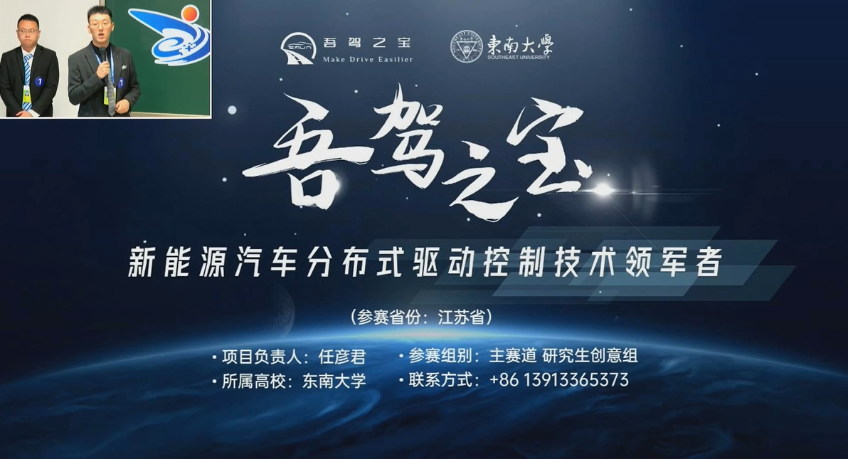 我院车辆工程系任彦君博士牵头完成的“吾驾之宝:新能源汽车分布式驱动控制技术领军者”项目,赛前精细打磨,赛中奋力拼搏,项目团队成员无数次挑灯夜战、推倒重来。尤其是在持续半年的强化训练中,他们认真听取校内外资深专家的培训、分析和指导,对项目内容精雕细刻,对路演和答辩细节字斟句酌。该项目在今年的江苏省省赛中,以分赛道全省第一、排位赛东南大学全校最高分的傲人成绩杀出重围,最终在全国总决赛中摘得银奖。此外,本项目还得到了江苏省教育厅推荐,受大赛组委会邀请,参展了今年的“慧秀中外”国际大学生创新创业成果展。“吾驾之宝”作为优秀创业项目的典型代表,在展会“时代先锋”篇章向世界的青年创业者们展示了东大学子“止于至善”的科技报国决心,讲述了机械“汽车人”艰难困苦、玉汝于成的动人创业故事。