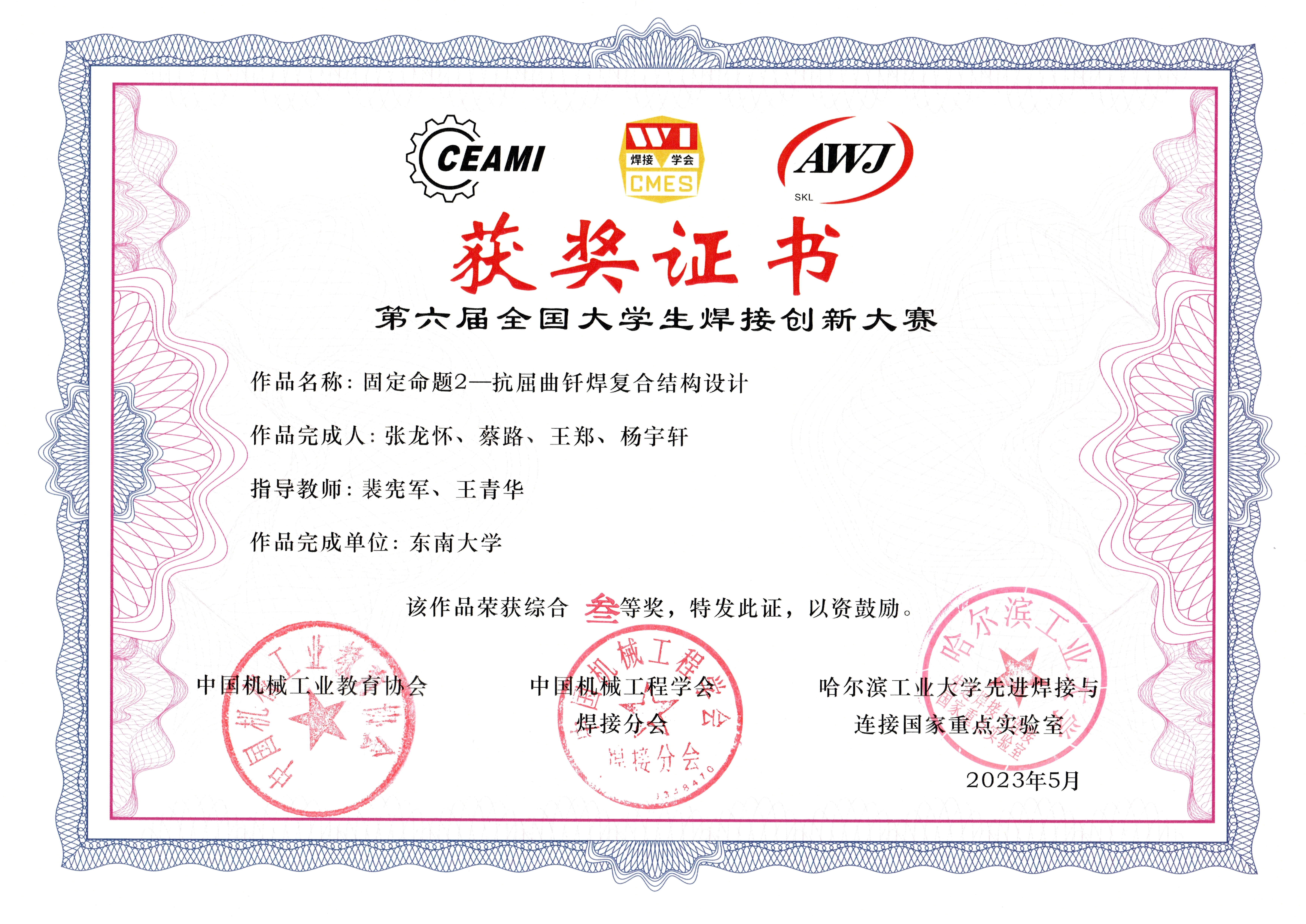 2023年5月26日至28日,第六届全国大学生焊接创新大赛暨第四届焊接技术与工程专业委员会成立大会在河南科技大学成功举办。本次大赛由中国机械工业教育协会、中国机械工程学会焊接分会、哈尔滨工业大学先进焊接与连接国家重点实验室主办。东南大学本届大赛共派出4支队伍参赛,最终获得一等奖1项、二等奖1项、三等奖2项。