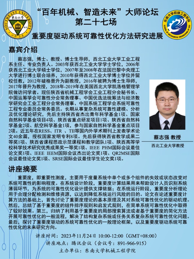 蔡志强,博士、教授、博士生导师,西北工业大学工业工程系主任、专业负责人。2003年获西北工业大学学士学位,2006年获西北工业大学硕士学位,2007年至2008年在法国巴黎中央理工大学进行博士联合培养,2010年获得西北工业大学博士学位并留校任教,2012年破格晋升为副教授,2016年被聘为博士生导师,2017年晋升为教授,2018年-2019年在美国西北大学凯洛格管理学院做访问学者。现任陕西省机械工程学会工业工程分会秘书长、中国运筹学会可靠性分会常务理事、中国优选法统筹法与经济数学研究会工业工程分会常务理事、中国系统工程学会系统可靠性工程专业委员会常务委员。长期从事复杂系统可靠性建模、分析及优化理论研究,先后主持陕西省杰出青年科学基金1项、国家自然科学基金项目4项、陕西省重点研发项目1项、陕西省自然科学基金2项、航空科学基金1项,参与国家自然科学基金重点项目2项。近五年在RESS、ITR 、TII等国内外学术期刊上发表学术论文40余篇,授权国家发明专利8项。先后获得陕西省教学成果二等奖1项、陕西省课程思政示范课程和教学团队1项、陕西高等学校科学技术研究优秀成果奖一等奖1项、IEEE PHM国际会议最佳论文奖1项、IEEE IEEM国际会议杰出论文奖1项、QR2MSE国际会议最佳论文奖1项、SRSE国际会议最佳学生论文奖1项。