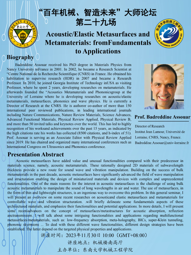 在这次讲座中,Badreddine Assouar教授将回顾过去在声学与弹性波超表面和超材料的研究工作,包括波和振动的控制。他将展示一些与声透射、反射和吸收有关的新颖概念,例如一些有趣的功能,比如低频吸声、超全息、BICs、super-Klein tunneling、phononic skyrmions。这些功能的实现运用具体的设计策略,这些策略对应具体的物理属性和应用,针对具体的应用来选择设计方法。