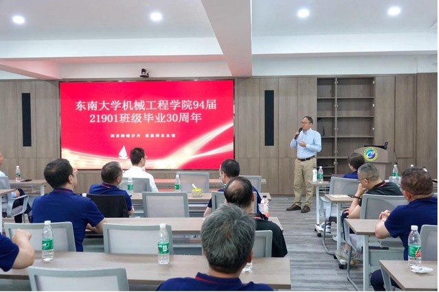班会上,原校长助理任祖平讲话,他指出东南大学教会学生最好的能力就是自主学习,这一能力使大家能够在毕业后的职场中应对自如。东南大学也在与时俱进,从实验室办学条件、办学理念等各方面都在赶超国际一流水平。他回忆起当年,毕业时赠送给21901班同学的六个字的目标“事业 友谊 爱情”,如今经过三十年回首,均已圆满完成。同时,他也为同学们的未来也提出了新六个字的希冀“健康 家庭 事业”。