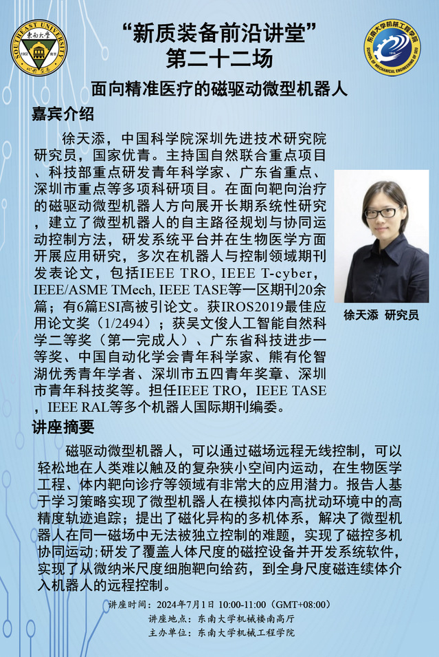 “新质装备前沿讲堂”第二十二场:徐天添研究员——面向精准医疗的磁驱动微型机器人