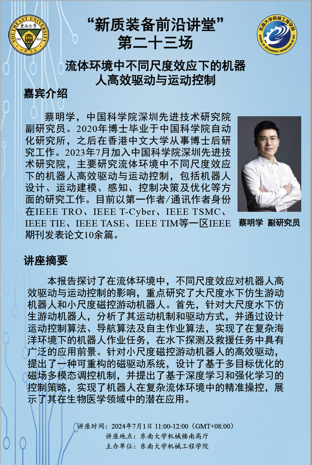 “新质装备前沿讲堂”第二十三场:蔡明学研究员——流体环境中不同尺度效应下的机器 人高效驱动与运动控制