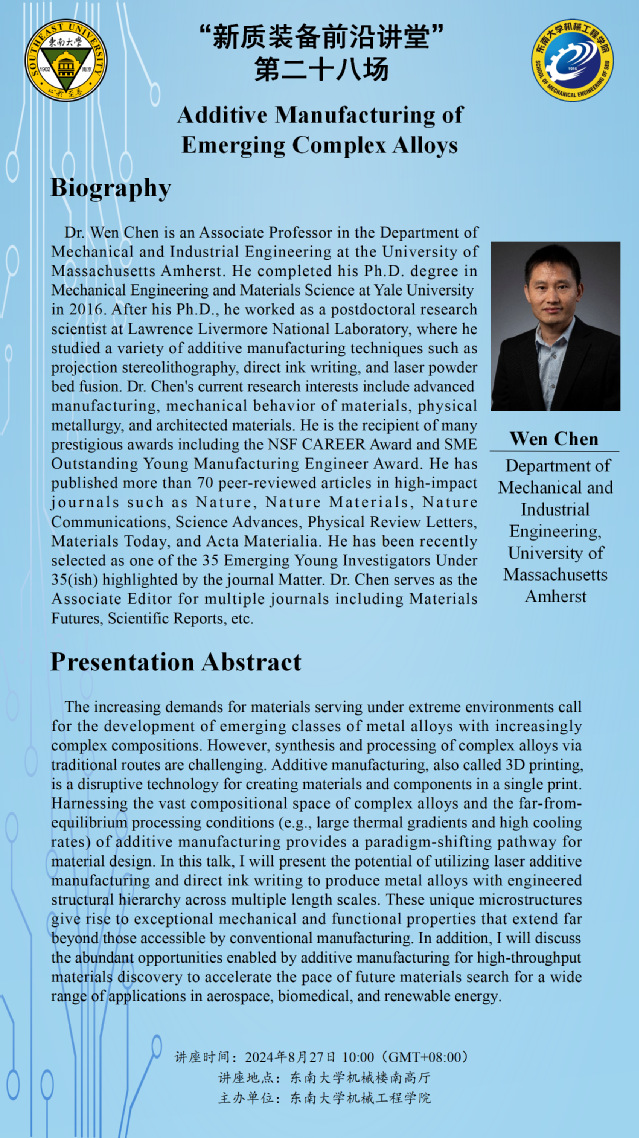 “新质装备前沿讲堂” 第二十八场:Prof. Wen Chen——Additive Manufacturing of Emerging Complex Alloys