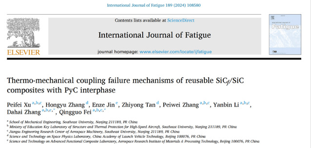 近日,我院航空航天系费庆国教授团队联合北京临近空间飞行器系统工程研究所,在耐高温陶瓷基复合材料的重复使用性能评价与性能演化机理方面开展攻关,并取得重要进展,在疲劳领域顶刊《International Journal of Fatigue》上发表了题为“Thermo-mechanical coupling failure mechanisms of reusable SiCf/SiC composites with PyC interphase”的研究成果。