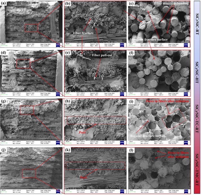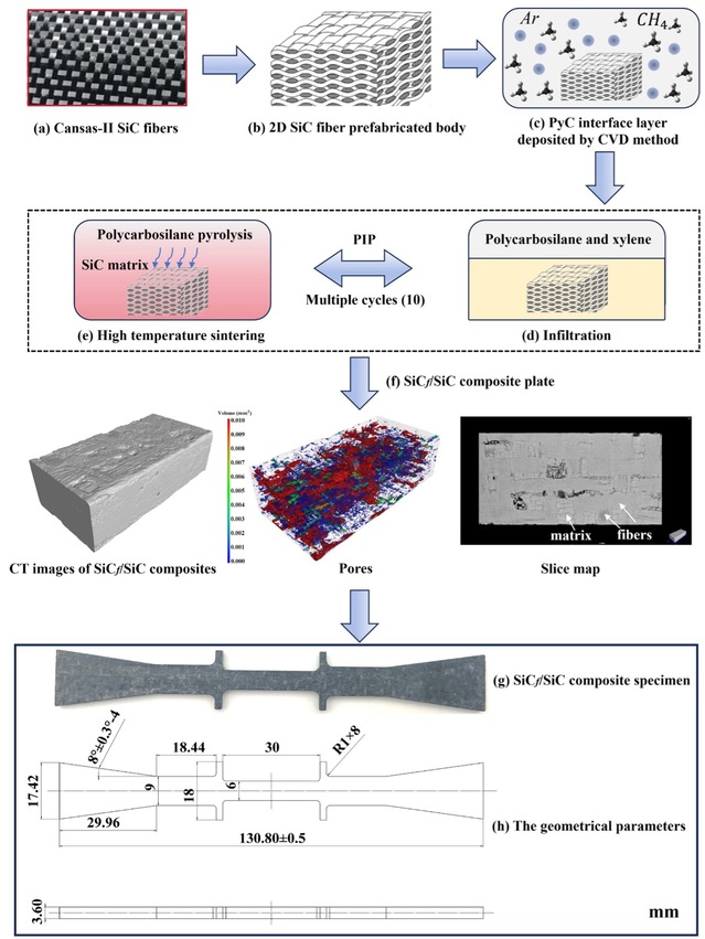 该研究主要针对SiC/PyC/SiC体系下的陶瓷基复合材料开展研究,该材料采用CVI+PIP混合制备方法进行制备,其中纤维和基体之间采用热解碳(PyC)作为界面相。为了全面分析重复使用条件下该材料的性能演化过程,本研究共设计了5组试验方案,主要包括常温下的准静态拉伸试验,高温下的准静态拉伸试验,循环高温后的材料性能评价试验,动态力/热耦合循环试验及剩余性能表征试验。研究表明,重复使用条件下的SiC/PyC/SiC的承载性能下降较为明显,这主要是由于界面相材料为PyC,其在大气环境中的抗氧化性能较弱,长时高温有氧环境最终导致材料性能的快速下降,同时在叠加上循环力载荷,结构性能下降更为明显。本研究通过微观组织和组分元素分析,准确表征了材料的力-热-氧耦合的损伤演化历程,揭示材料的在循环力/热耦合载荷作用下的损伤演化机理。此外,该研究通过材料的滞回模量定义材料在服役不同时刻的损伤量,利用连续介质损伤力学的方法,构建了材料的损伤演化模型,为此类材料的寿命预示提供了理论依据。