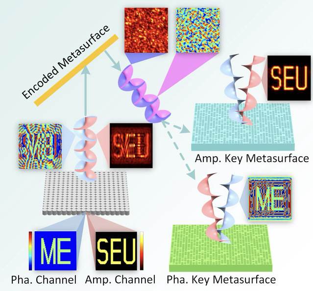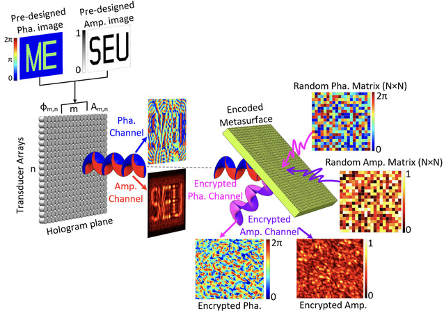 近年来,声学超全息技术受到了极大关注,因为它能够利用声学超材料/超表面对声波进行特殊操控,例如声波异常折射与反射、声聚焦、弯曲声束、声扩散等,从而将声场投射成任意形状和投射到任意位置。声学全息图像中最受关注的物理量是声波振幅(或强度),它表示声音能量的空间分布,可应用于微粒操控,声场重建或超声波治疗等。在传统的声全息技术中,全息图的相位分布是微不足道的,通常不会影响物理效果。然而,在信息通信方面,我们可以将全息图像作为需要传递的信息,因此其物理效应并不重要。在这种情况下,相位则是一种有价值的信息载体,其分布与振幅一样包含信息,振幅和相位可以是两个独立的信息通道。目前,综合、全面地使得声全息技术成为声通讯的一项成熟技术手段仍是一个具有挑战性的难题。另一方面,作为通信安全的重要保证,信息的加密与解密方式是至关重要的。目前对于声全息图像传输过程中的加密手段的研究也十分有限。