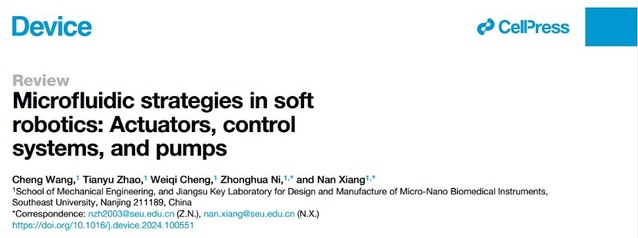 近日,我院项楠教授/倪中华教授团队在微流控技术促进软体机器人自主化、无绳化和智能化方面取得重要进展,研究系统回顾了微流控技术在软致动器、软控制系统和软泵等软体机器人学关键领域的广泛应用和最新进展,揭示了微流控与软体机器人学高度相关的技术体系和相辅相成的发展规律,相关成果以“Microfluidic Strategies in Soft Robotics: Actuators, Control Systems, and Pumps”为题发表在《Cell》旗下新期刊《Device》上。