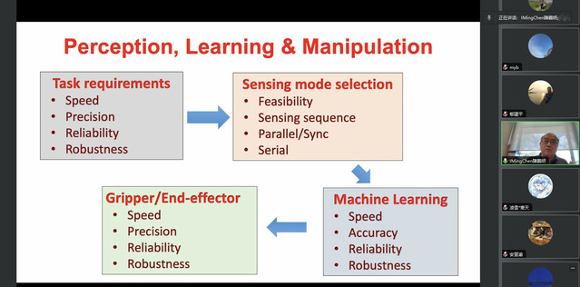 近年来,工业机器人系统广泛用于制造业、物流行业和医疗行业。将工业机器人(机械臂)应用到这些行业中的关键技术包括感知和机器学习技术。9月13日,新加坡工程院院士南洋理工大学I-Ming Chen(陈义明)教授,IEEE和ASME Fellow,应邀为我院师生就 “制造、物流和医院供应系统中的感知和学习”进行了线上学术讲座。本次讲座由我院窦建平老师主持,吸引了线上和线下师生的热情参与。