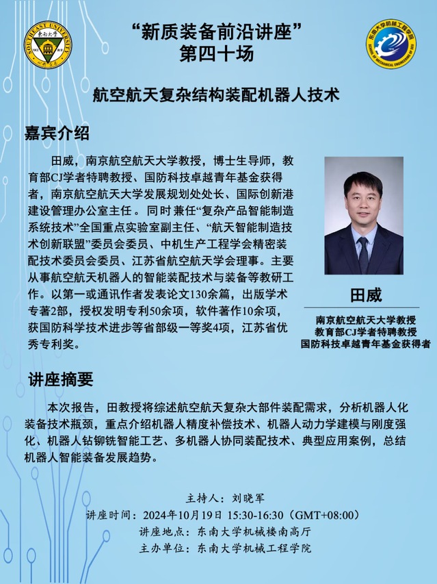 “新质装备前沿讲座” 第四十场:田威教授——航空航天复杂结构装配机器人技术