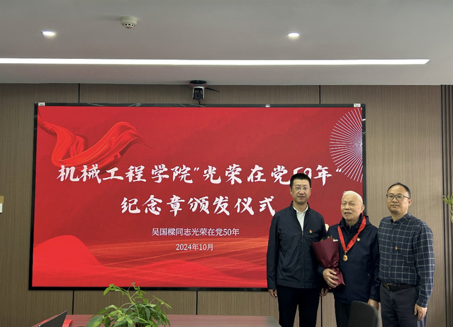 在交流班会环节结束后,学院为吴国樑校友也是本院的退休教师,颁发了入党五十周年勋章。