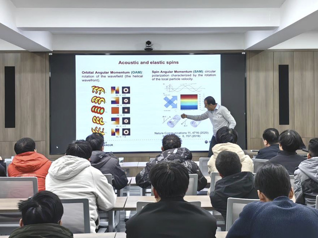 在讨论环节中,Badreddine Assouar教授积极解答师生提出的问题,进一步介绍如何使用自旋角动量作为新的自由度来操纵波的传播,并展示在光子和声学系统中产生斯格米子的具体例子。
