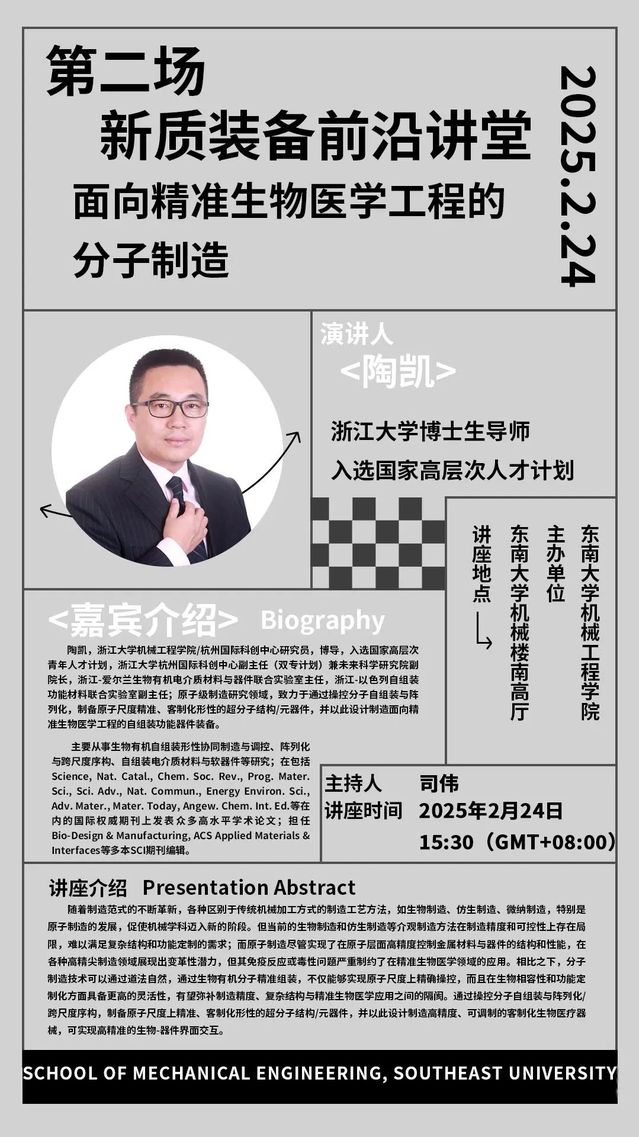 2025年机械学院“新质装备前沿讲堂”第二场:陶凯教授——面向精准生物医学工程的分子制造
