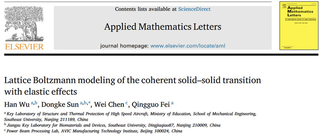 近日,我院2023级直博生吴寒同学在格子玻尔兹曼方法及其应用研究领域取得新进展。研究成果以“Lattice Boltzmann modeling of the coherent solid–solid transition with elastic effects”为题发表于国际期刊《Applied Mathematics Letters》,该期刊为应用数学领域top期刊、中科院二区期刊、JCR一区期刊。