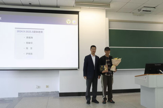 会议伊始,院长费庆国代表学院为退休教师代表高福海老师颁发荣休纪念牌,感谢退休老师为学院发展倾注的心血和汗水。全场教职工以热烈掌声向长期以来扎根学院、辛勤付出的退休老师们致以诚挚的敬意。