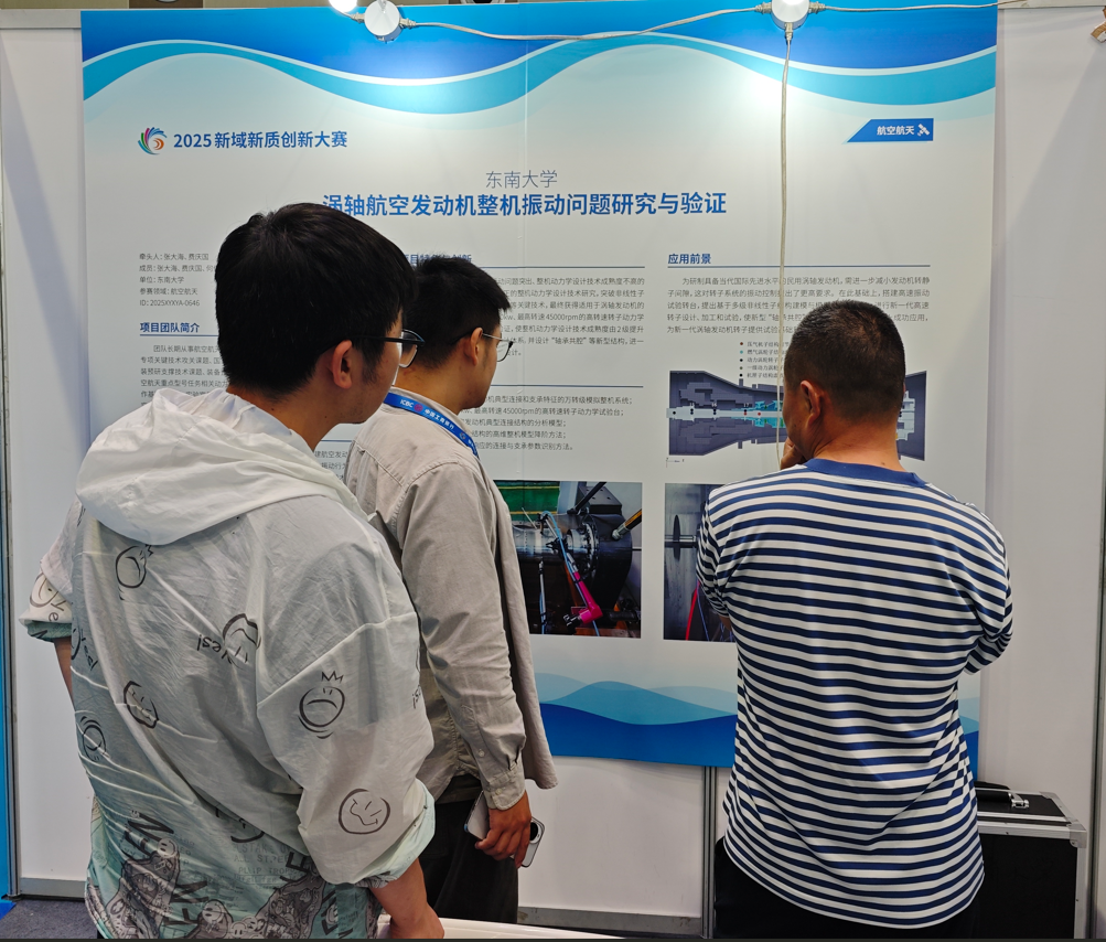 工业和信息化部主办的2025新域新质创新大赛决赛在青岛圆满收官。在学校研究生院和学院的指导下,学院何俊增、李宏宇、刘家璇、郝尤明、王文祥、余冠霆(指导教师:费庆国、张大海)组成的赛队“涡轴航空发动机整机振动问题研究与验证”项目,作为东南大学唯一进入全国总决赛的项目,历经全国预选赛、初赛和决赛的激烈角逐,最终获得优胜奖,充分展现了机械学院师生勇于挑战、创新不止的风采。