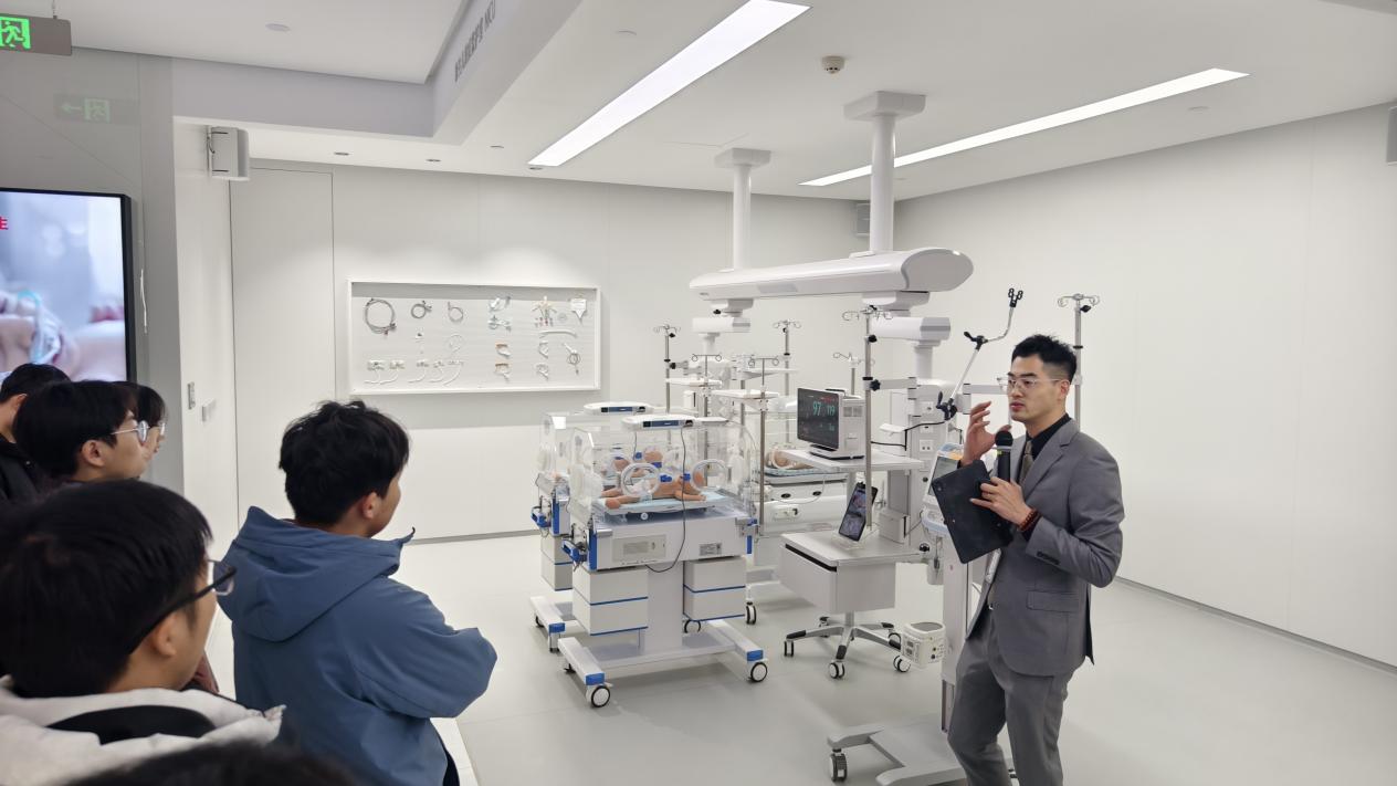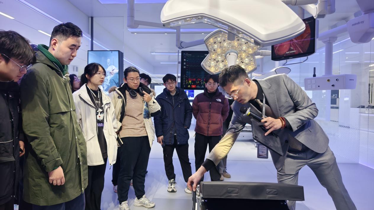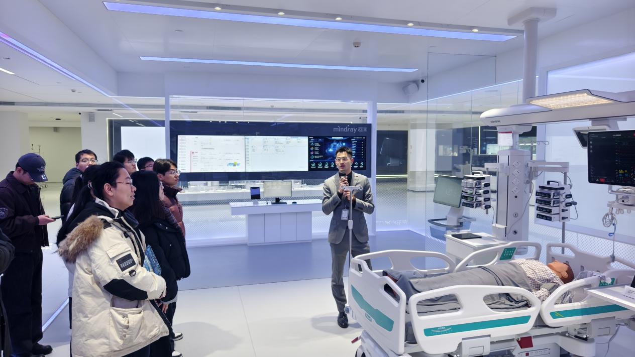 活动伊始,师生抵达迈瑞园区,在培训楼展厅及产线进行了实地参观。通过讲解员的详细介绍,大家系统了解了迈瑞医疗的发展历程、产业布局与产品体系。从多功能手术台、患者监测系统,到全自动无人生产线,同学们亲身感受到高端医疗装备的制造水平与技术创新实力。