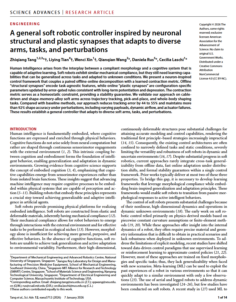 近日,我院唐志强、王乾乾教授团队联合新加坡国立大学Cecilia Laschi教授与麻省理工学院Daniela Rus教授团队在国际顶级综合性学术期刊Science Advances发表题为“A general soft robotic controller inspired by neuronal structural and plastic synapses that adapts to diverse arms, tasks, and perturbations”的研究论文,提出了一种面向软体机器人的通用学习与控制框架,在多任务执行、复杂环境适应以及跨平台泛化方面取得重要进展(图1)。