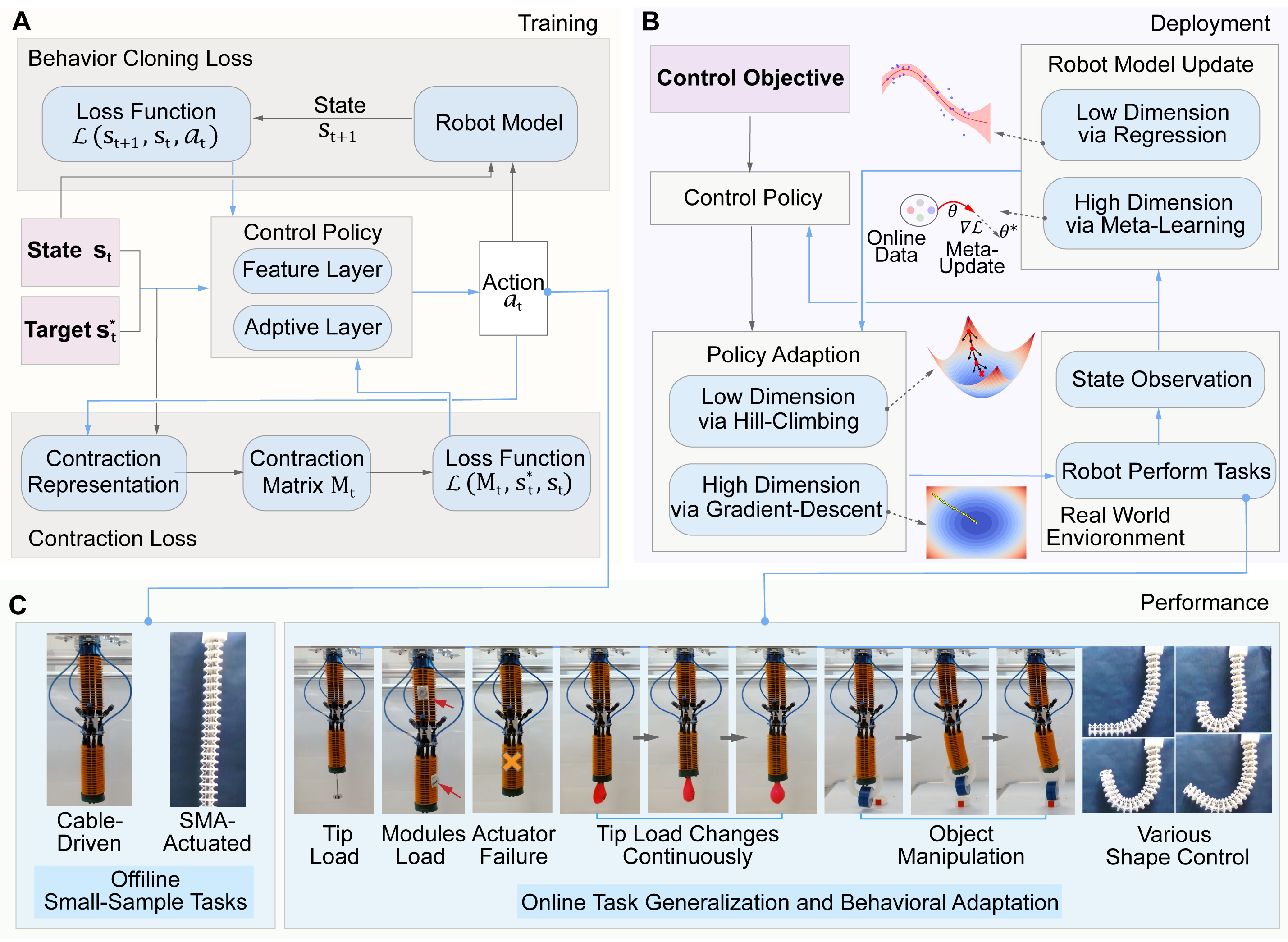 研究团队在多种真实软体机械臂平台上对该方法进行了系统验证,包括绳驱软体臂与形状记忆合金驱动软体臂。实验任务涵盖轨迹跟踪、物体操作以及整体形态控制等典型场景(图3)。实验结果表明,该控制框架能够在负载连续变化、环境扰动以及执行器部分失效等复杂条件下保持较高控制精度和稳定性,显著优于传统方法,展示了良好的鲁棒性与泛化能力。该成果融合了软体机器人、机器学习与控制理论等多学科优势。研究工作不仅为软体机器人在未知环境中的自主运行提供了新的技术路径,也为构建具有“感知—决策—执行”闭环能力的智能软体机器人系统奠定了理论与方法基础。论文的发表标志着我院在软体机器人智能控制方向取得又一重要进展,进一步提升了学院在机器人与智能系统领域的国际学术影响力。