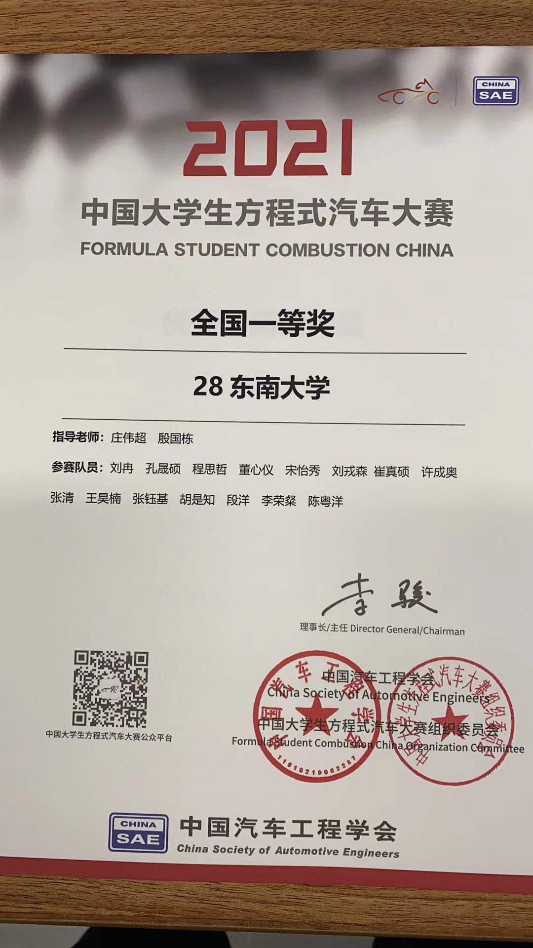 车队的成长离不开学校的支持。感谢东南大学校长办公室、教务处、保卫处、校团委、机械工程学院、工培中心等学校各部门的支持。感谢殷国栋、庄伟超、毕可东、王斌、范巧林等车队指导老师。