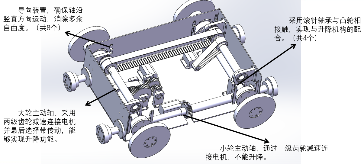 通过该抬升机构,将大轮抬起,使其在最高点时仅有大轮着地,在最低点时只有小轮着地,大小轮交错布置实现四向移动。