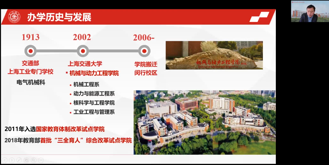 上海交通大学机械与动力工程学院胡永祥副书记从学科专业基本情况、新时代人才培养定位以及培养体系与主要举措三个方面分享了上交机械与动力工程学院的建设情况,详细介绍了其人才培养体系改革、宽口径交叉融合课程体系建设、“机械-数学”双学位项目设立等基本内容和所获成效。