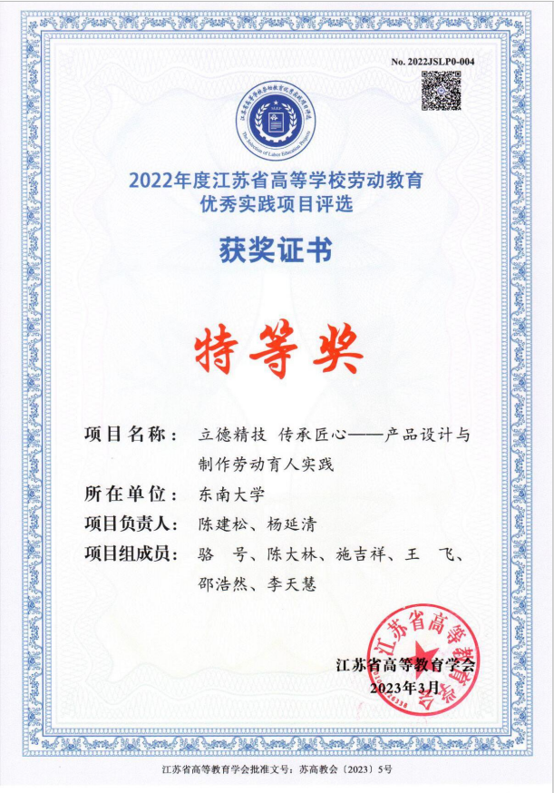 近日,江苏省高等教育学会公布首届江苏省高校劳动教育优秀实践项目评选结果,我校获特等奖2项、一等奖4项,同时获得2022年江苏省高等学校劳动教育优秀实践项目申报优秀组织奖。我院工业发展与培训中心“立德精技·传承创新—产品设计与制作劳动育人实践”项目喜获特等奖。