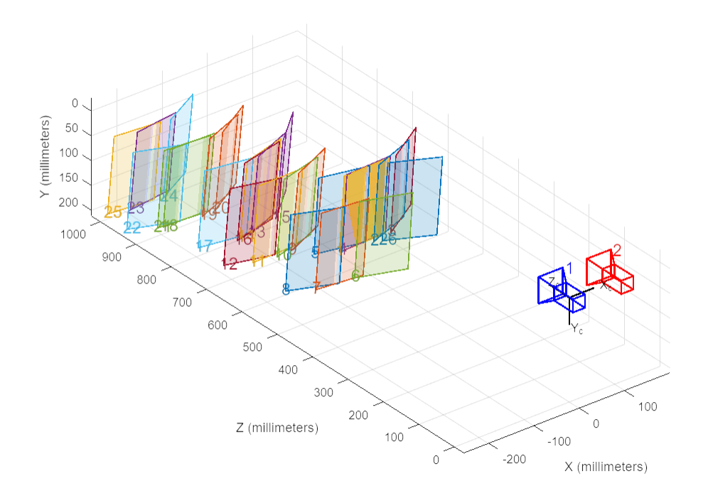 2. 参数采集。使用matlab工具箱提供的应用“stereo camera calibrator”进行双目标定,将图片标定结果保存到matlab工作区,删去误差较大的图组后,通过编写程序将主要参数excel形式导出。